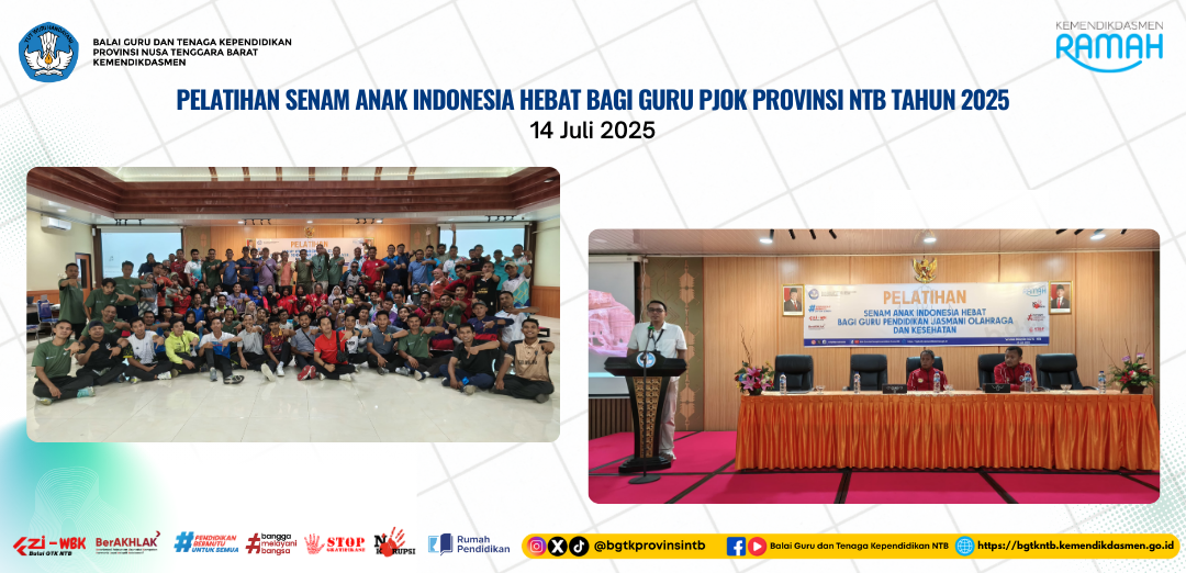 BGTK NTB – Balai Guru dan Tenaga Kependidikan (BGTK) Provinsi NTB kembali menyelenggarakan kegiatan strategis dalam rangka peningkatan kompetensi guru, kali ini melalui Pelatihan Senam Anak Indonesia Hebat (SAIH) bagi Guru PJOK di Provinsi NTB Tahun 2025. Kegiatan berlangsung meriah dan penuh semangat diikuti oleh 120 peserta yang telah terdaftar, berasal dari berbagai kabupaten/kota di Pulau Lombok dan Sumbawa.
