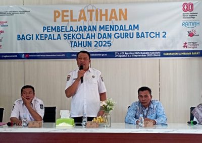 Kepala BGTK NTB, Wirman Kasmayadi, dalam sambutannya pada pembukaan (27/08/2025) menekankan pentingnya kesiapan guru bertransformasi, baik dalam pembinaan karakter siswa maupun peningkatan profesionalisme melalui uji kompetensi dan PPG. Hal senada disampaikan oleh Syarif Hidayatullah, Kepala Cabang Dinas Dikbud Lombok Tengah menegaskan penerapan tujuh kebiasaan anak Indonesia sehat sebagai upaya membentuk karakter peserta didik. Sementara itu, di Kabupaten Sumbawa Barat, Lutpiah Ruswati, Kepala Bidang GTK, mendorong para peserta untuk serius mengikuti pelatihan agar manfaatnya nyata di sekolah masing-masing. Adapun di Kabupaten Sumbawa, M. Husnul Alwan, Kabid Pembinaan SD, menyampaikan guru dan kepala sekolah sebagai garda terdepan yang mampu mewujudkan pembelajaran yang mendalam, menantang, sekaligus menyenangkan.